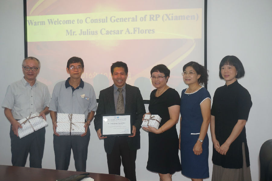 The Consul General delivered a speech afterwards. He talked about the importance of education and cultural exchanges between Philippines and China and was pleased to see the achievements of the School in the study of Southeast Asia, especially in the field of Philippines studies. He expressed his deep impression on the rich collection of Southeast Asian and overseas Chinese research resources in the School when he visited it in early October 2014. This visit was on behalf of the Philippines Consulate in Xiamen to present a professional books on the history, culture and art of Philippines to the School Library, in hope for helping the School make more achievements in the field of Southeast Asian research. Deputy Dean Shi Xueqin thanked the Consul General for his books and his promotion of the Philippines study of the School. Finally, the two sides exchanged gifts, and took part in a group photo of all the teachers and students.