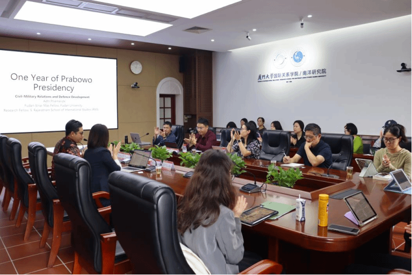 During the discussion session, Associate Professor Bao Guangjiang and Assistant Professor Wang Shuqi from the School of International Relations/Nanyang Research Institute at Xiamen University raised questions on "democratic transition and military power tensions" and "neighboring countries' attitudes toward the Indonesian regime," respectively. Professor Zhang Miao supplemented the discussion with insights on "interactions between the military and the business sector," to which Researcher Priamarizki responded in detail.