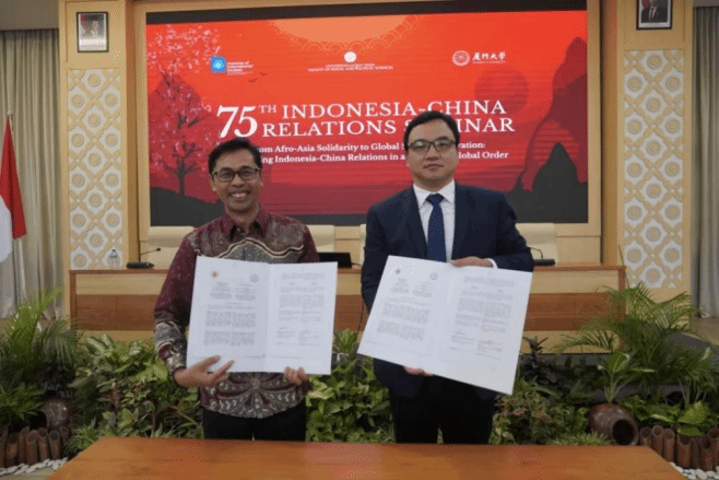 On October 3, 2025, in Yogyakarta, Indonesia, a symposium was held to mark the 75th anniversary of China-Indonesia diplomatic relations. During the event, the School of International Relations/Research School of Southeast Asian Studies at Xiamen University and the Faculty of Social and Political Sciences at Gadjah Mada University signed an agreement to establish a Joint Research Center on China-Indonesia Relations. The signing was attended by Professor Gao Yanjie, Dean of Xiamen University's school, and Professor Wawan Mas'udi, Dean of Gadjah Mada University's faculty.